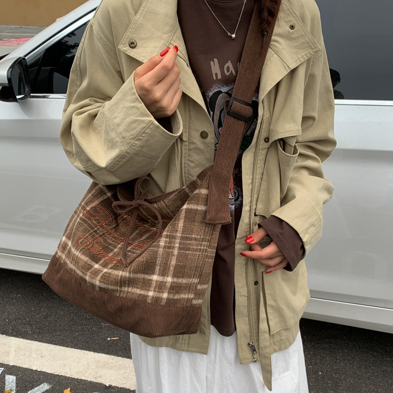 New Plaid Single Shoulder Bag for Women, Large Capacity Lazy Style Canvas Bag, Double-Sided Commuter Bag, Student Class Backpack